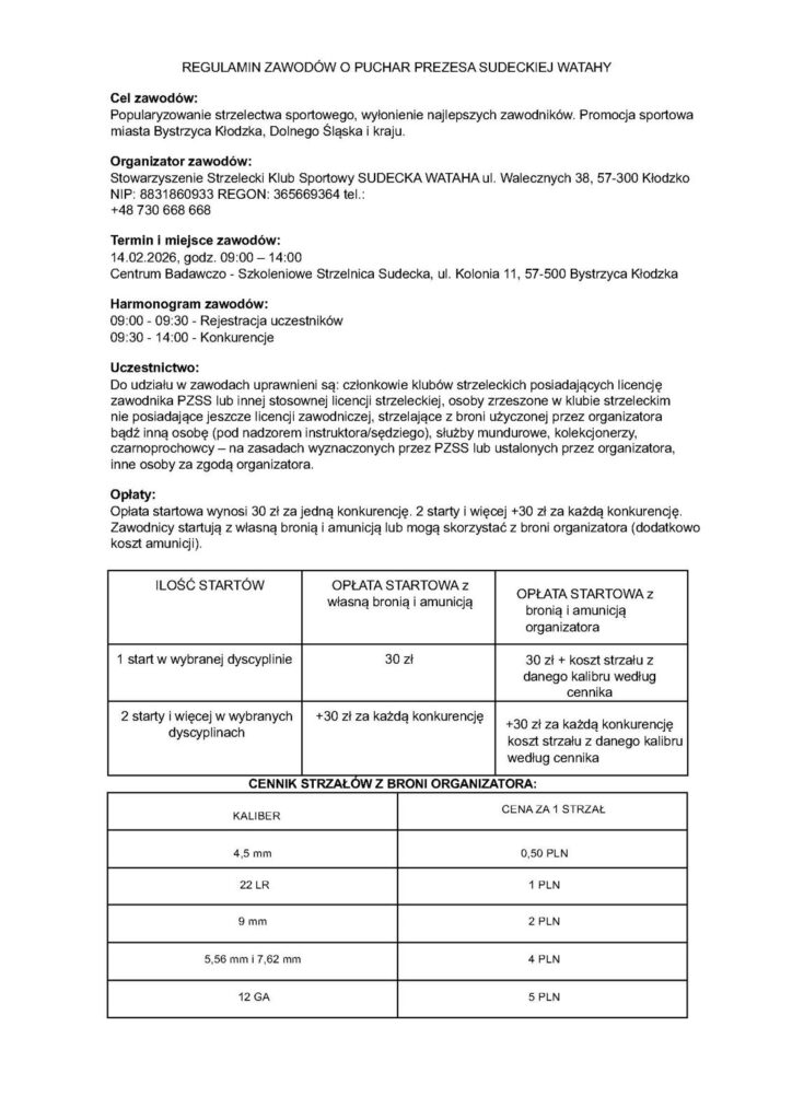 14 lutego 2026 r. zapraszamy Was na Zawody Strzeleckie o Puchar Prezesa Sudeckiej Watahy, które odbędą się w Centrum Badawczo-Szkoleniowym Strzelnica Sudecka w Bystrzycy Kłodzkiej.